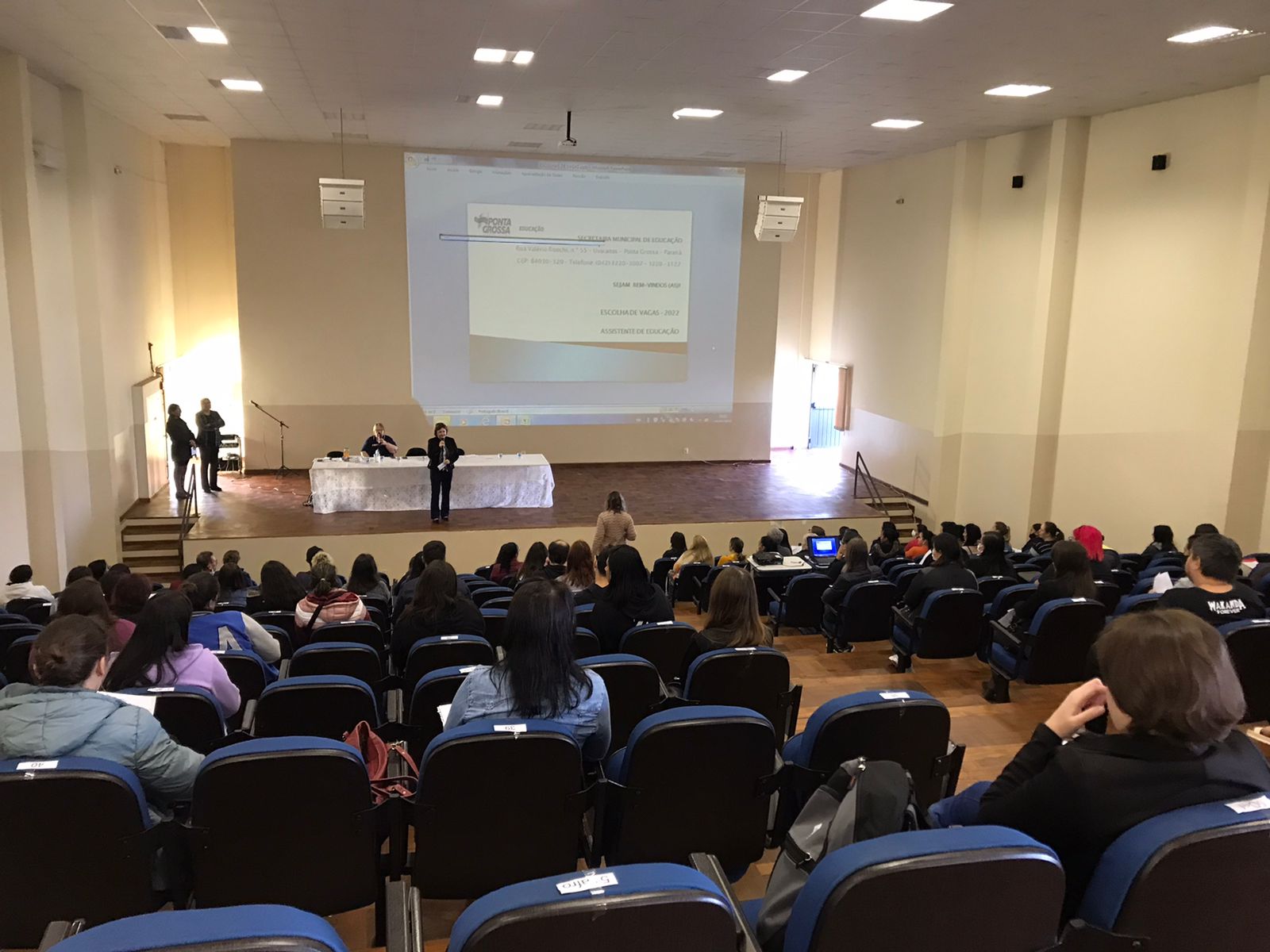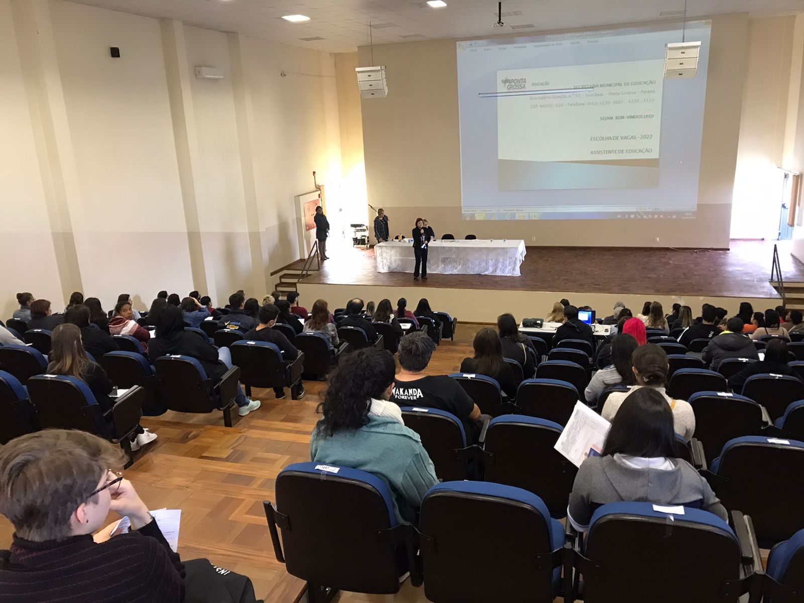 A Prefeitura de Ponta Grossa recepcionou os novos profissionais aprovados em concursos públicos para atuar na área da Educação nesta terça-feira (19), no Anfiteatro Eunice Miró Guimarães. São 194 profissionais convocados, a maioria deles para os cargos de escriturário (55) e de assistente de educação (123), aprovados em concursos realizados em abril deste ano. Houve ainda a convocação de professores (11) e auxiliares de serviços gerais – trabalhadores braçais (5). A escolha de vagas aconteceu no período da manhã para assistentes e à tarde para escriturários.